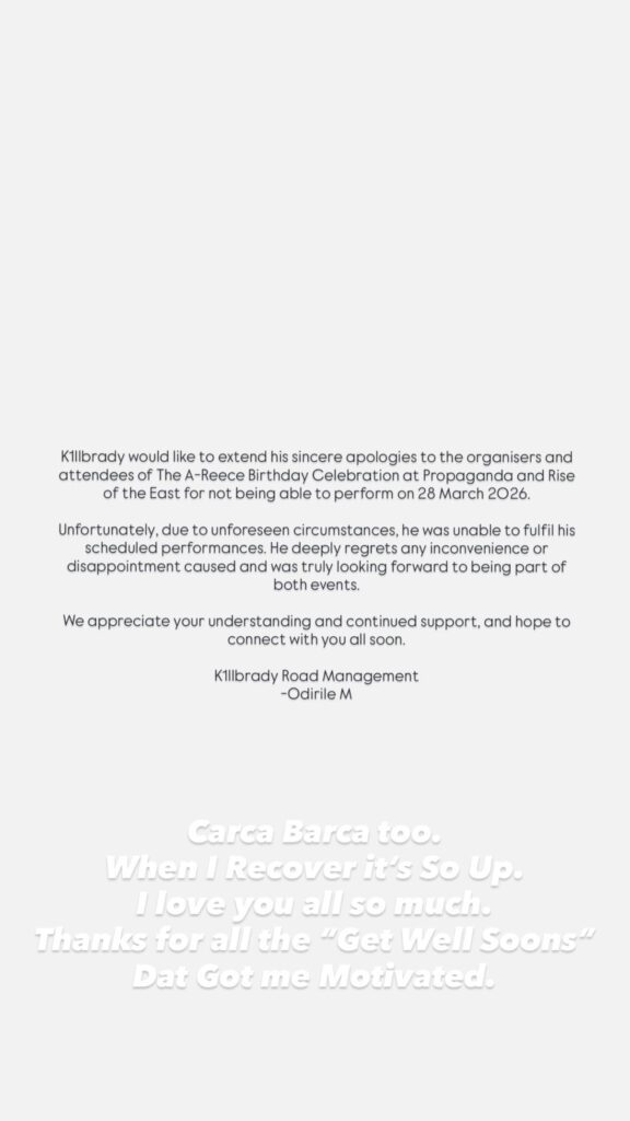 “K1llbrady would like to extend his sincere apologies to the organisers and attendees of The A-Reece Birthday Celebration at Propaganda and Rise of the East for not being able to perform on 28 March 2026,” the statement read. “Unfortunately, due to unforeseen circumstances, he was unable to fulfil his scheduled performances. He deeply regrets any inconvenience or disappointment caused and was truly looking forward to being part of both events.”